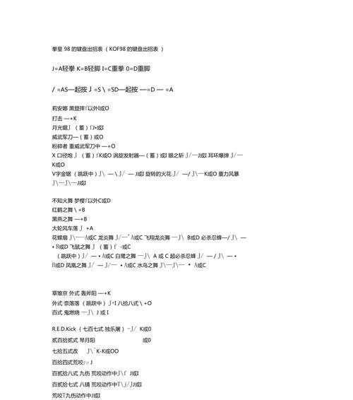 作为经典的格斗游戏,电脑拳皇97一直深受玩家喜爱。想要在游戏中取得优势,熟练掌握游戏的按键技巧是必不可少的。本文将为大家详细介绍电脑拳皇97的按键教程,帮助玩家们在游戏中大展身手。